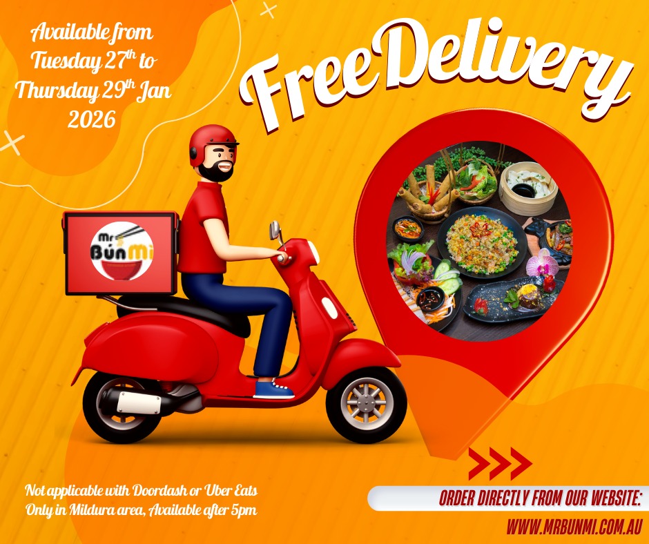 - Ordering directly from our website: mrbunmi.com.au then click Order Now and select Free Delivery Promotion By Mr Bun Mi ( Free delivery promotion is only applicable within the vicinity of Mr Bun Mi restaurant).